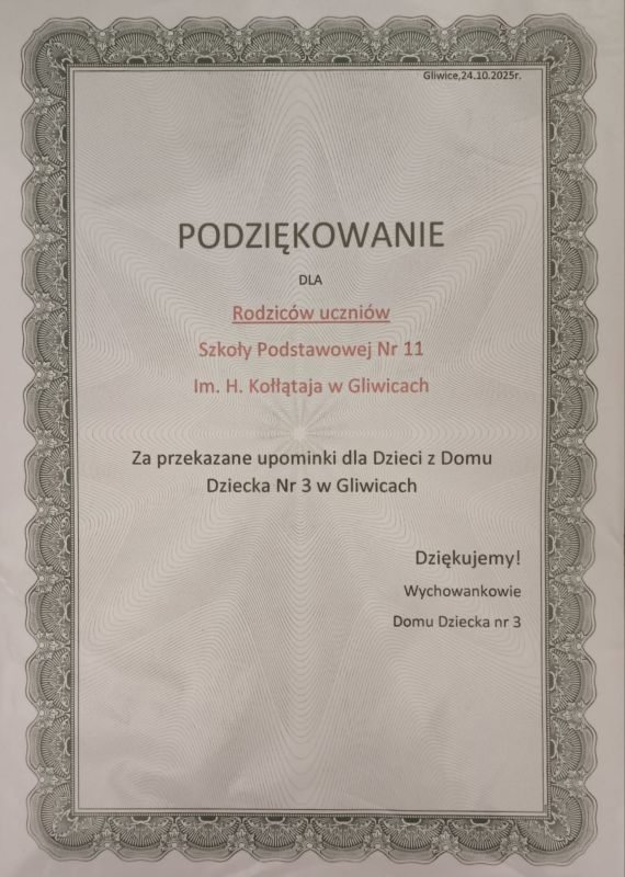 Szkolne Koło Wolontariatu SP 11 ,,Pomocne Serca ” pragnie złożyć serdeczne podziękowania Wszystkim tym, którzy wsparli naszą akcję zbiórki artykułów szkolnych i sportowych, piżam, klapek i ręczników oraz parasoli, zabawek i słodyczy dla dzieci z Domu Dziecka nr 3 w Gliwicach. Kolejny raz mogliśmy pomóc i wywołać uśmiech na twarzach dzieci.