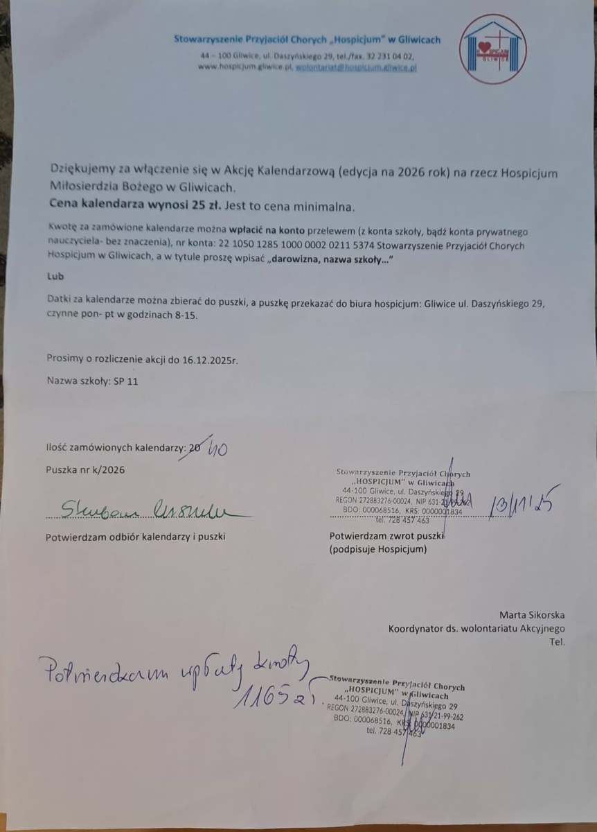 Jak co roku przystąpiliśmy do akcji na rzecz Hospicjum Miłosierdzia Bożego w Gliwicach – „Kalendarz w każdej klasie”. Jak zwykle społeczność naszej Szkoły stanęła na wysokości zadania i zakupiła wszystkie kalendarze uzyskując pokaźną sumę na tak szczytny cel.