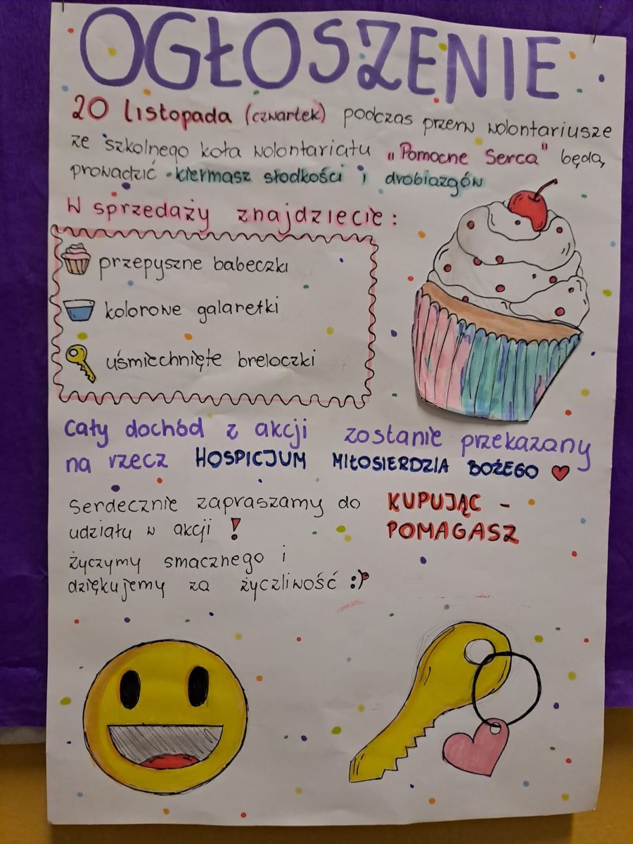 20 listopada 2025 r. (czwartek) podczas przerw wolontariusze ze Szkolnego Koła Wolontariatu „Pomocne Serca” będą prowadzić kiermasz słodkości i drobiazgów! 🍰✨