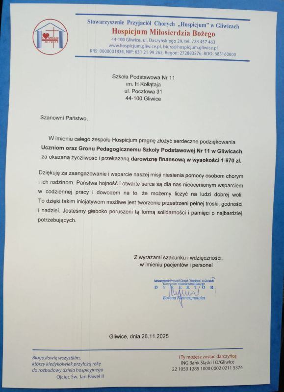Serdecznie DZIĘKUJEMY wszystkim rodzicom, uczniom oraz pracownikom szkoły za okazaną życzliwość, wsparcie i zaangażowanie. Dzięki Wam nasza wspólna inicjatywa mogła odnieść tak piękny sukces i realnie przyczynić się do pomocy potrzebującym.