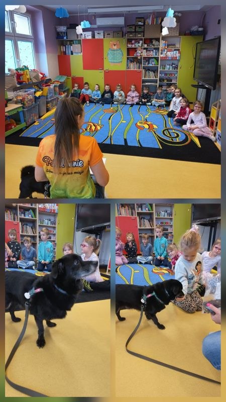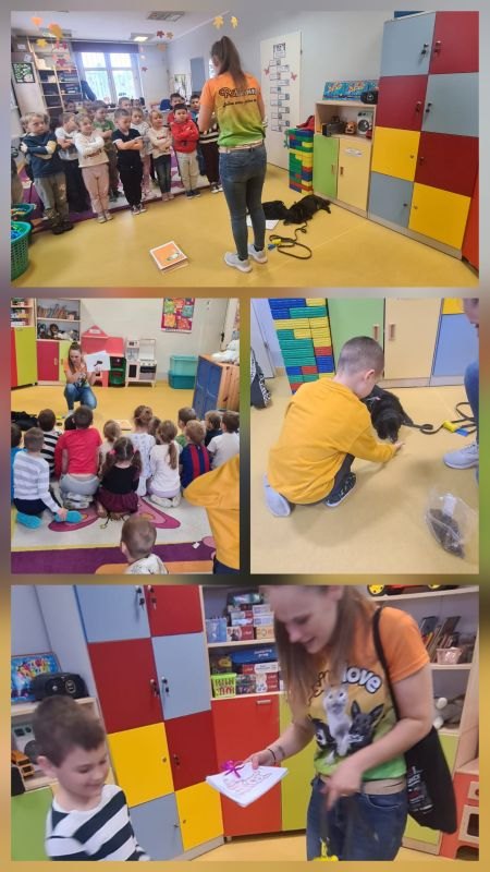 Z okazji obchodzonego niedawno Dnia Kundelka🐶 grupy Jeżyków🦔, Misiów🐻 i Żabek🐸 odwiedziła Pani Magda, która na co dzień pracuje w zabrzańskim schronisku Psitul mnie. Spotkanie obfitowało w wyjątkowe momenty, a piesek Murzynek🐾 zachwycił wszystkie Przedszkolaki.🥰 Dzieci dowiedziały się na czym polega praca schroniska oraz jak dbać i pomagać zwierzętom, które tam przebywają. Od teraz wiedzą również, jak należy zachować się w kontakcie z agresywnym psem – potrafią zrobić pozycję drzewa 🌳i żółwika🐢.