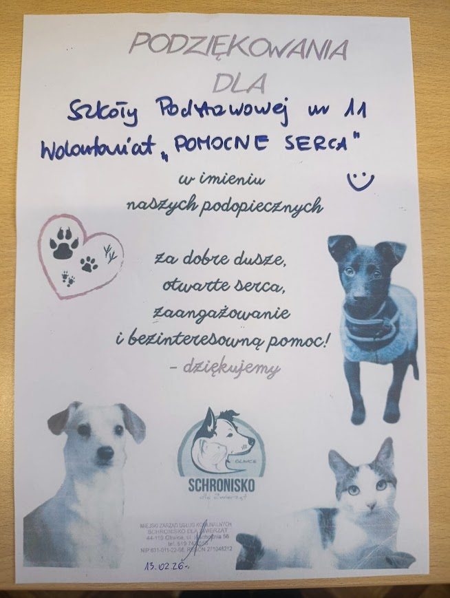 Podziękowania dla uczniów i rodziców za ich wielkie serce, a szczególnie dla pani Sabiny Czabok-Zdeb, która w naszym imieniu przekazała dary do schroniska w Sośnicy.