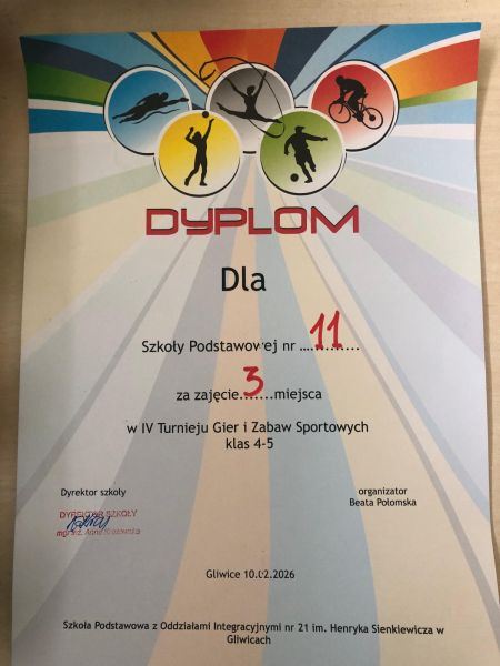 10.02.2026 r. nasza reprezentacja z klasy 5 brała udział w Turnieju Gier i Zabaw. Zawody te odbyły się w SP 21 . Nasza drużyna dzielnie się spisała pokonując różne konkurencje tj: rzuty do celu, do kosza, pokonanie toru przeszkód na czas, przeciąganie liny. W końcowym efekcie zdobyliśmy 3 miejsce🥉Skład naszej reprezentacji: Anastazja Grądkowska, Dominika Badura,Zosia Płoszczyca, Tobiasz Dasiak, Oskar Popławski, Wiktor Pośpiech.