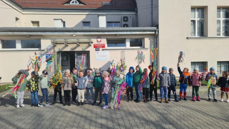 Pierwszy dzień wiosny był bardzo radosny – całe przedszkole wyruszyło na wspólny spacer. Dzieci niosły własnoręcznie wykonane gaiki i śpiewały wiosenne piosenki, witając nową porę roku. Obserwowały pierwsze pąki na drzewach, słuchały śpiewu ptaków i wypatrywały oznak nowej pory roku. Gaiki powiewały na wietrze, dodając całemu wydarzeniu wyjątkowego, niemal magicznego charakteru. Po powrocie do przedszkola dzieci z zapałem tworzyły prace plastyczne inspirowane wiosną.