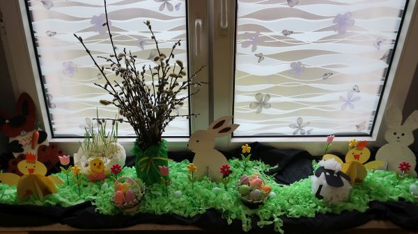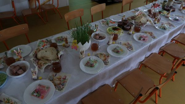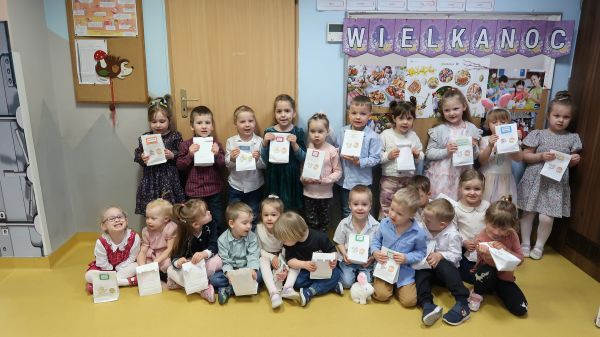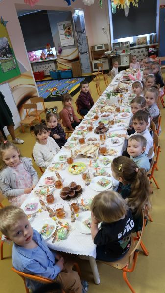 Przedszkolaki obejrzały film na temat tradycji związanych z nadchodzącymi Świętami, a następnie zasiadły wspólnie do pięknie nakrytych stołów. Nie zabrakło jajek, białej kiełbasy, chleba i innych wielkanocnych potraw. W salach zagościły baranki, kurczaczki, a także stroiki z rzeżuchą i owsem.