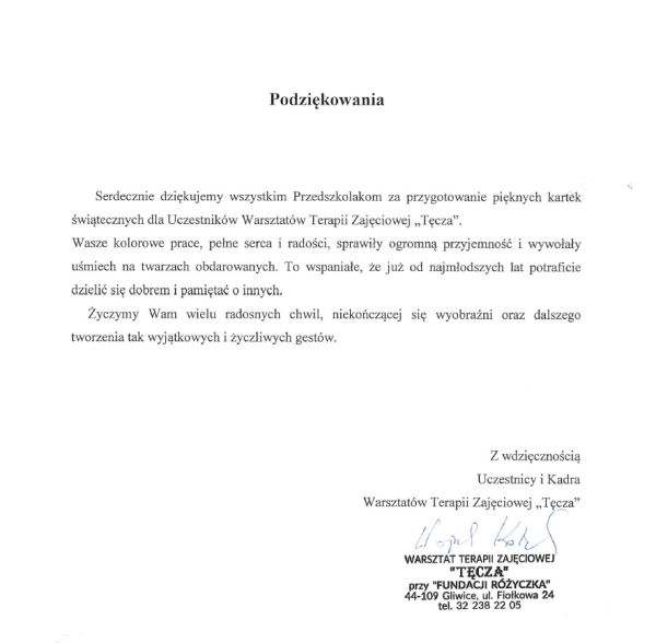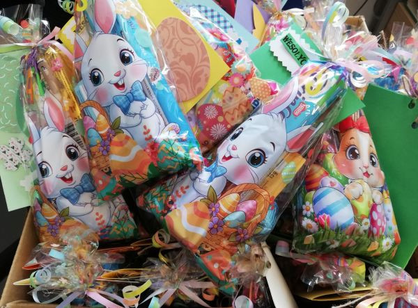 Z okazji Świąt Wielkanocnych Przedszkolaki ze Szkoły Podstawowej nr 11 wraz z Paniami zorganizowały zbiórkę słodyczy dla dzieci z Placówki Wsparcia Dziennego PRZYSTAŃ oraz dla Uczestników Warsztatów Terapii Zajęciowej TĘCZA prowadzonych przez Fundację RÓŻYCZKA w Gliwicach. Dzieciaki stanęły na wysokości zadania i zebrały górę słodyczy. Do paczek dołączono także własnoręcznie przygotowane kartki świąteczne. Przygotowane paczki wywołały dużo uśmiechu na twarzach obdarowanych osób, dlatego serdecznie dziękujemy Przedszkolakom i Rodzicom, którzy zaangażowali się w zbiórkę.