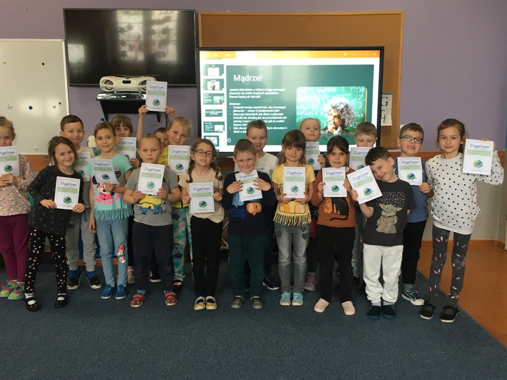 W każdej grupie dzieci wykonały tego dnia wspaniałe prace plastyczne np. ekologiczną kulę ziemską, wiosenne zielone drzewko. Podsumowaniem dnia wypełnionego zabawami było zasadzenie drzewka na terenie naszej szkoły/przedszkola oraz wręczenie dyplomów.