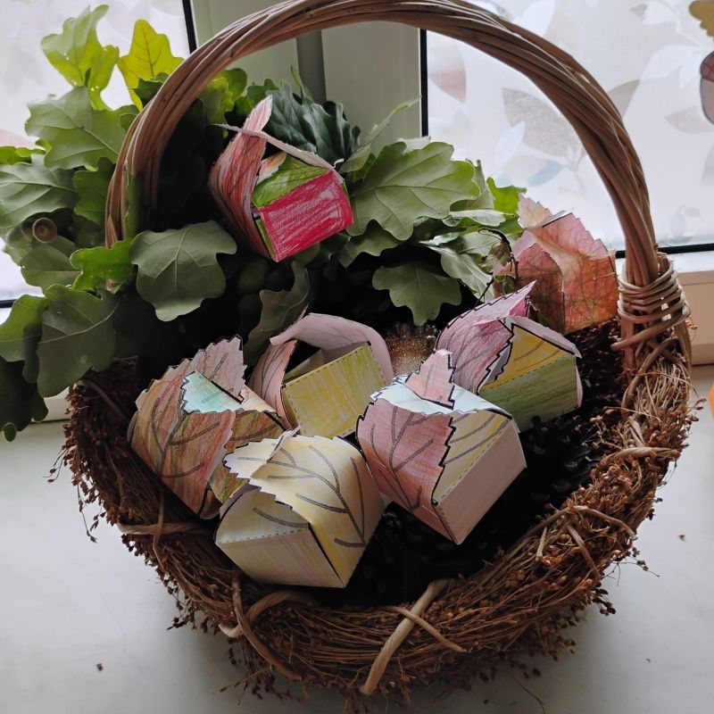 A gdzie schować kasztany, żołędzie, szyszki i…? O tutaj do jesiennego pudełeczka w kolorach złota, pomarańczy i czerwieni. Sami zobaczcie jakie one piękne są 🙂